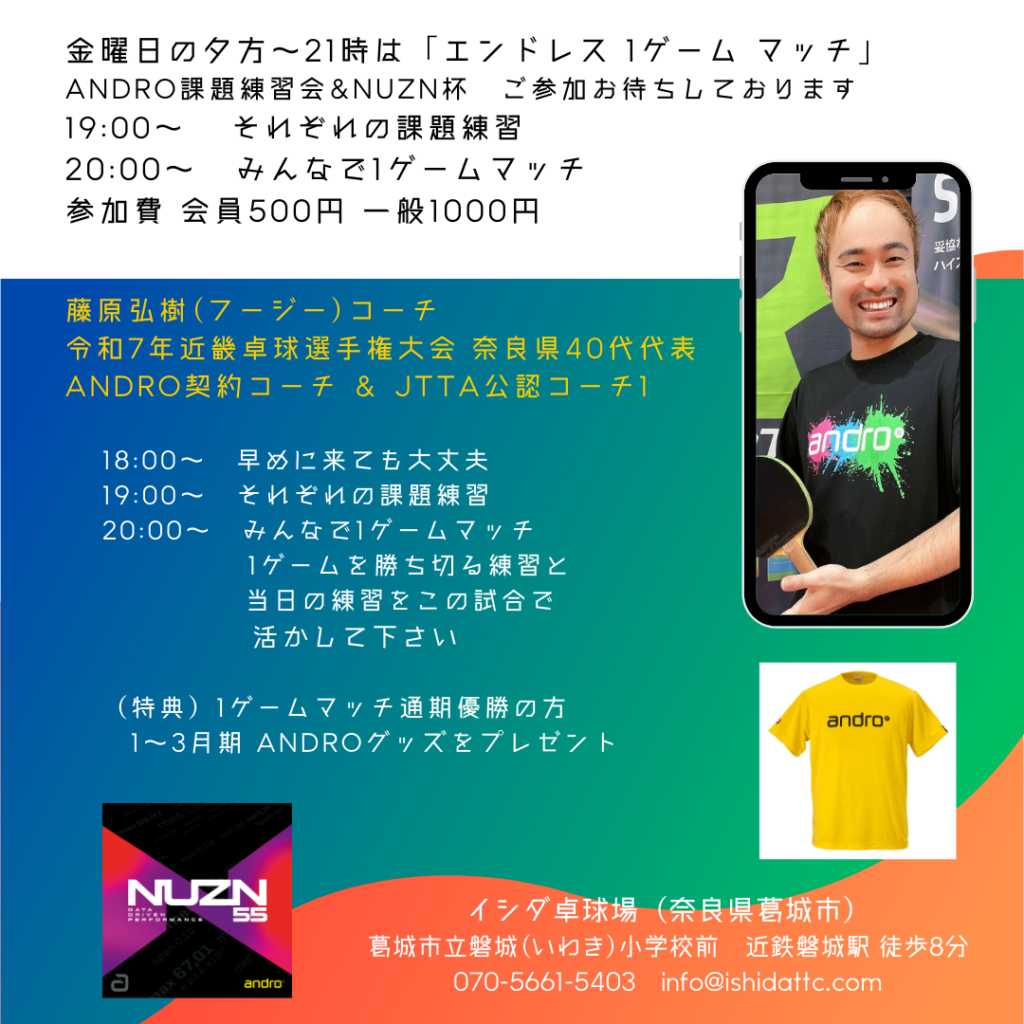 お知らせ ㊗andro公式HPとandro2026カタログに『藤原弘樹 所属:イシダ卓球場』で掲載!! フージーandro契約コーチのご紹介です。イシダ卓球場 with andro特設サイト『卓球入魂🏓🏓』開設しました。 金曜夜は『andro課題練習会 & NUZN杯』を開催中!! ※詳細はクリック