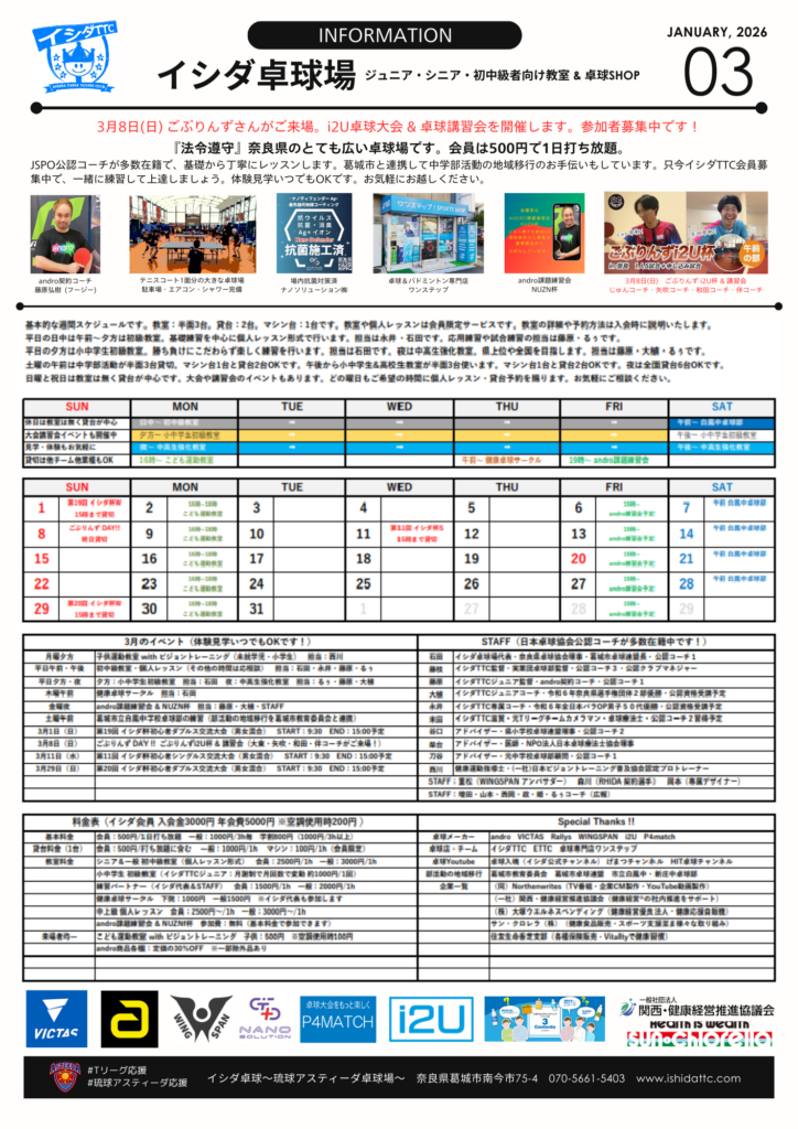 お知らせ 令和8年2月のスケジュールです。私どもはJSPO公認コーチが多数在籍する卓球場です。葛城市のご協力のもと、市内中学部活動の地域移行のお手伝いをしています。昨年末からSNS界隈で当卓球場の良くない噂があり、卓球メーカーやお客様、役所関係からも問い合わせがありました。噂は事実無根であり、只今営業妨害や名誉棄損等で、葛城市教育委員会様他と連携して法的対処中です。私どもは『法令遵守』の精神で、地域の皆様に愛される卓球場となる事をここに宣誓いたします。お気軽にお越しくださいませ。
