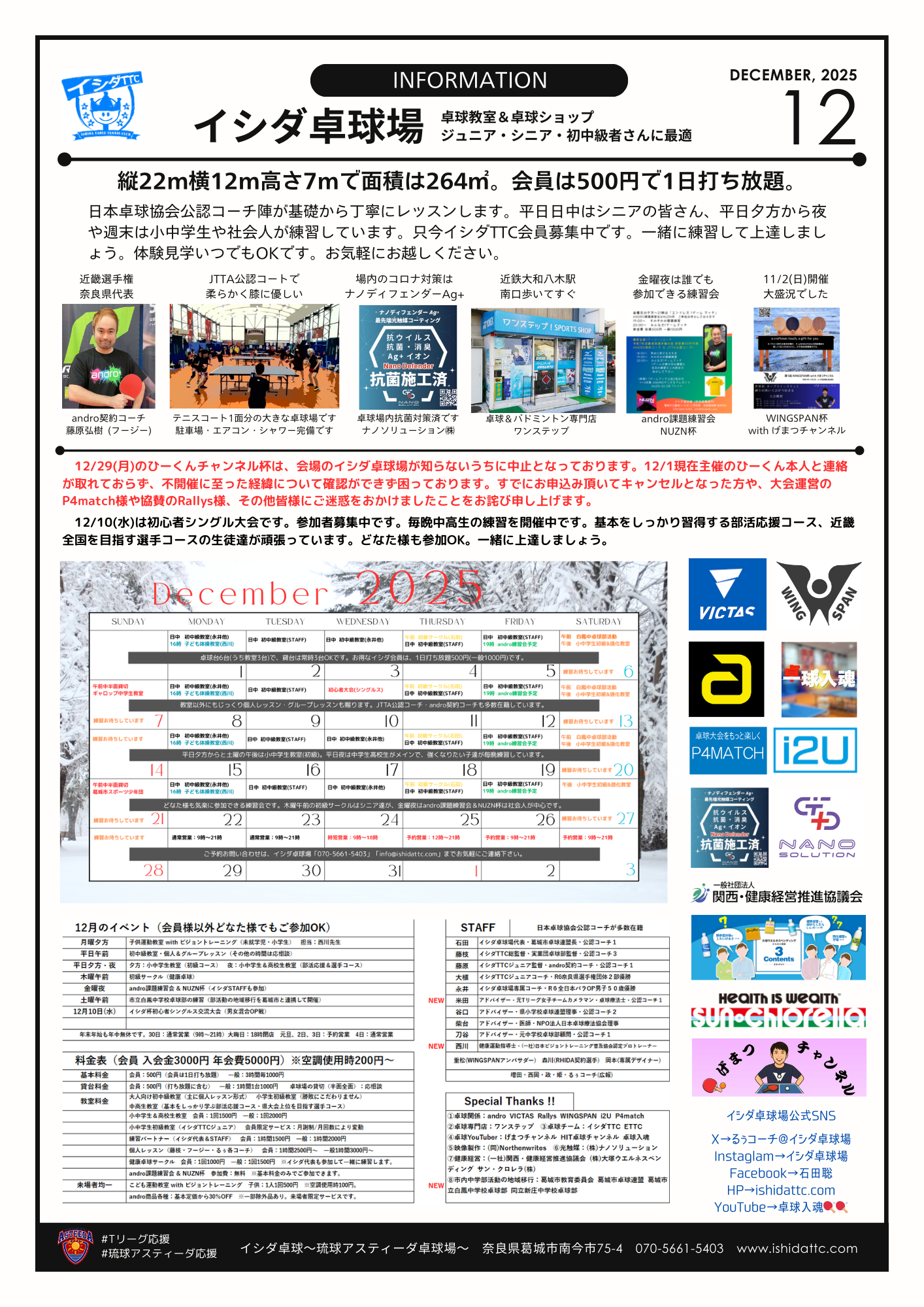 令和7年12月のスケジュールです。10日(水)は第8回イシダ杯初心者シングル大会。ダブルス大会は年末のためお休みです。ご参加お待ちしております。29日のひーくんチャンネルカップは私どもが知らぬ間に中止となっており戸惑っております。参加予定の方や関係者様企業様を含め、ご迷惑をおかけした事をお詫び申し上げます。画像が小さいの大きくしてご覧ください。※適時、Xやインスタグラムでも更新いたします。 2025.12.26 2025.09.25