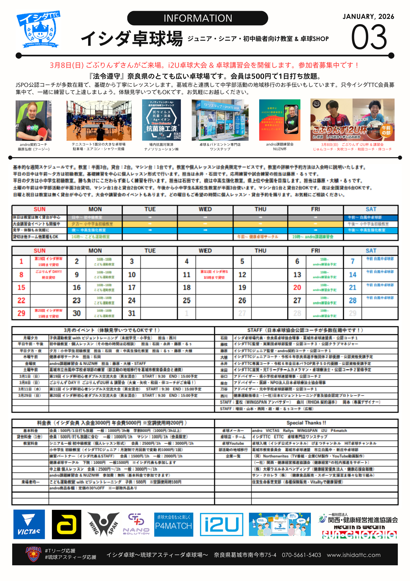 主なイベントは、①3月1日(日)第19回イシダ杯初心者ダブルス交流大会(9時~15時位まで) ②3月8日(日)ごぶりんずさんが奈良県にやってくる。ごぶりんずDAY!!(終日) ③3月11日(水)第11回イシダ杯初心者シングルス交流大会(9時~15時位まで) ④3月20日(日)第20回イシダ杯初心者ダブルス交流大会(9時~15時)です。