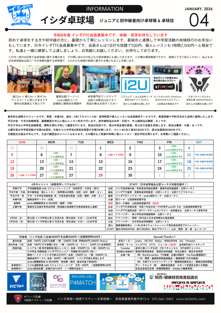 お知らせ 令和8年4月の予定です。令和8年度(4月~3月)のイシダTTC会員を募集中です。入会金3000円・年会費5000円。1日打ち放題500円ほか、各種特典がございます。見学はいつでもOKです。お気軽にお越しください。※詳細はクリック お知らせ